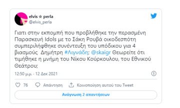 Την εμφάνισή του στην εκπομπή του Σάκη Ρουβά, «Idols», που προβλήθηκε την Παρασκευή, 10 Δεκεμβρίου στο ΣΚΑΪ, και που ήταν αφιερωμένη στο Νίκο Κούρκουλο έκανε ο Δημήτρης Λιγνάδης.