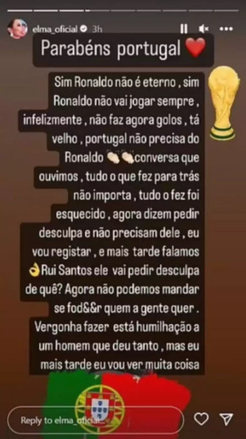 «Ναι, ο Ρονάλντο δεν είναι αιώνιος, ναι, ο Ρονάλντο δεν θα παίζει για πάντα, δυστυχώς δεν βάζει γκολ τώρα, είναι μεγάλος, η Πορτογαλία δεν χρειάζεται τον Ρονάλντο. Μιλήσαμε για αυτά που ακούσαμε, όμως όλα αυτά που έκανε δεν είναι πλέον σημαντικά, όλα όσα έκανε ξεχάστηκαν. Τώρα ζητούν συγγνώμη και δεν τον χρειάζονται. Το σημειώνω και θα μιλήσουμε αργότερα γι’ αυτό. Σάντος, θα ζητήσεις συγγνώμη; Τώρα μπορούμε να γ@@@ όποιον θέλουμε. Είναι κρίμα να ταπεινώνεις έναν άνθρωπο που έχει δώσει τόσα πολλά», έγραψε χαρακτηριστικά η αδερφή του Κριστιάνο Ρονάλντο, Κάτια Αβέιρο.