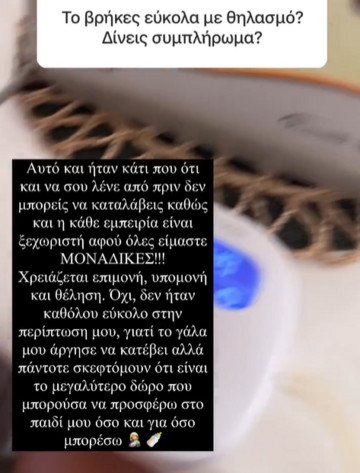 «Χρειάζεται επιμονή, υπομονή και θέληση. Όχι δεν ήταν καθόλου εύκολο στην περίπτωση μου γιατί το γάλα μου άργησε να κατέβει αλλά πάντοτε σκεφτόμουν ότι είναι το μεγαλύτερο δώρο που μπορούσα να προσφέρει στο παιδί μου, όσο για όσο μπορέσω», ανέφερε, μεταξύ άλλων, η Κωνσταντίνα Σπυροπούλου.