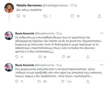 Από την άλλη η Ρούλα Κορομηλά, δεν φάνηκε να πείστηκε με την ανάρτηση της παρουσιάστριας και σε δικό της ποστ στο Twitter έγραψε: «Στις ψυχαγωγικές εκπομπές, όταν η κεντρική παρουσιάστρια κρίνει, επιθυμεί να μην προβληθεί κάτι στον αέρα της εκπομπής της για κάποιους λόγους, σαφώς και δεν προβάλλεται… Άλλα λόγια να αγαπιόμαστε».