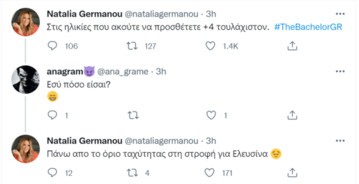Ένας ακόλουθος την ρώτησε: “Εσύ πόσο είσαι;”, με την Ναταλία Γερμανού να του δίνει μία αφοπλιστική απάντηση: “Πάνω από το όριο ταχύτητας στη στροφή για Ελευσίνα”!
