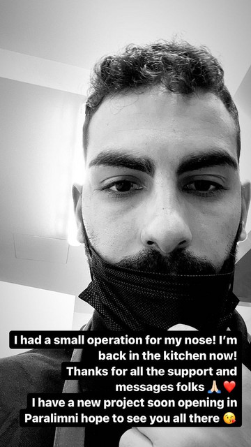 Αρχικά, ο Κύπριος σεφ δημοσίευσε μια φωτογραφία από το κρεβάτι του νοσοκομείου με επίδεσμους στη μύτη και ύστερα, μια φωτογραφία που εξηγεί τον λόγο της εγχείρησής του. Δήλωσε χαρακτηριστικά: «Έκανα μια μικρή επέμβαση στη μύτη. Τώρα, επέστρεψα στην κουζίνα. Σας ευχαριστώ για τη στήριξη και τα μηνύματά σας».