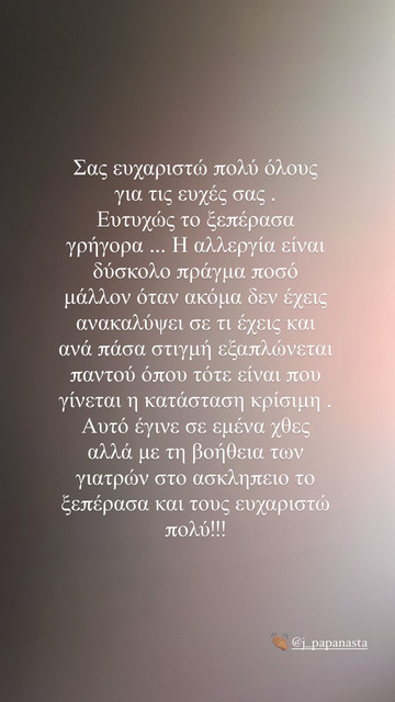 «Σας ευχαριστώ πολύ όλους για τις ευχές. Ευτυχώς το ξεπέρασα γρήγορα… Η αλλεργία είναι δύσκολο πράγμα πόσο μάλλον όταν ακόμα δεν έχεις ανακαλύψει σε τι έχεις και ανά πάσα στιγμή εξαπλώνεται παντού όπου τότε είναι που γίνεται η κατάσταση κρίσιμη. Αυτό έγινε σε εμένα χθες αλλά με τη βοήθεια των γιατρών στο Ασκληπιείο, το ξεπέρασα και τους ευχαριστώ πολύ», έγραψε η Ιφιγένεια Τζόλα για την περιπέτεια υγείας της.