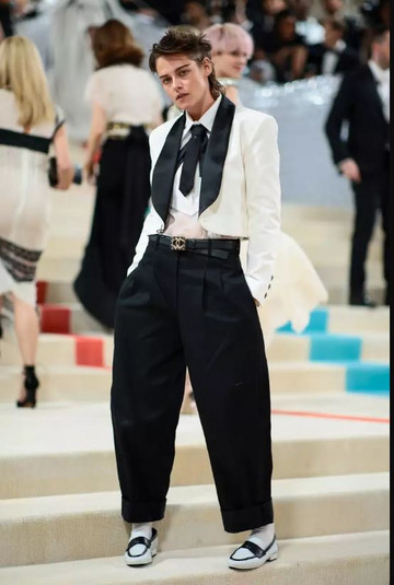 Η Kristen Stewart με ανδρόγυνο Chanel look που έχει την υπογραφή Karl Lagerfeld.
