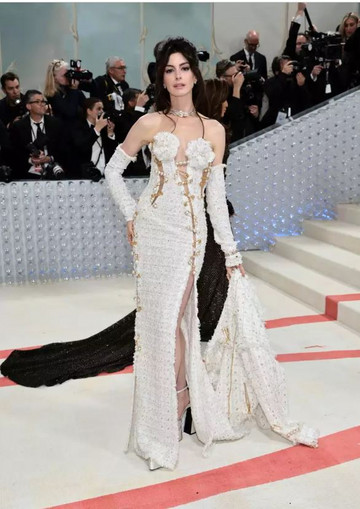 H Ann Hathaway με maxi tweed φόρεμα από τον οίκο Versace.