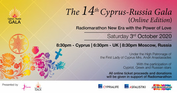 Το 14ο Φιλανθρωπικό Γκαλά Κύπρου – Ρωσίας θα πραγματοποιηθεί διαδικτυακά το Σάββατο 3 Οκτωβρίου 2020 στις 8.30 μ.μ. ώρα Κύπρου / 6.30 μ.μ. ώρα Ηνωμένου Βασιλείου/ 8:30 μ.μ. ώρα Μόσχας, υπό την Υψηλή Προστασία της Πρώτης Κυρίας της Κυπριακής Δημοκρατίας, κ. Άντρης Αναστασιάδη και θα το παρακολουθήσουν χιλιάδες άτομα ανά τον κόσμο.