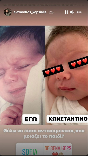 Σύμφωνα με τον Αλέξανδρο Κοψιάλη ο νεογέννητος Κωνσταντίνος μοιάζει σ’ εκείνον αν και κάποιοι followers της Σοφίας Φυρού έχουν διαφορετική γνώμη.