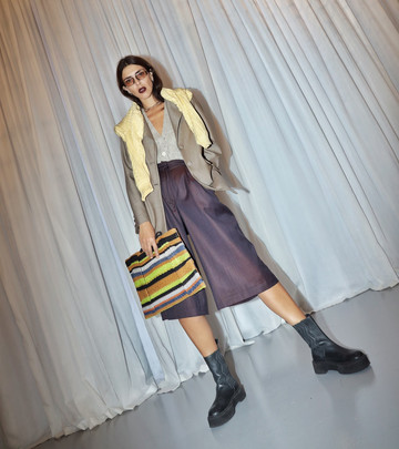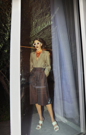 Κοστούμι, γαλάζιο και πορτοκαλί πουκάμισο, βερμούδα και πλισέ φούστα, όλα από Blanc Studio
