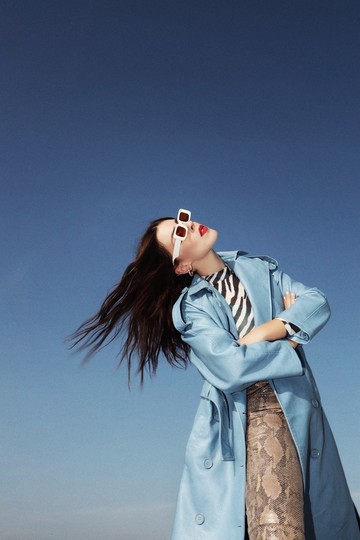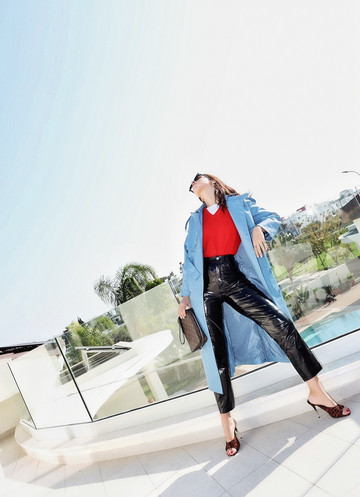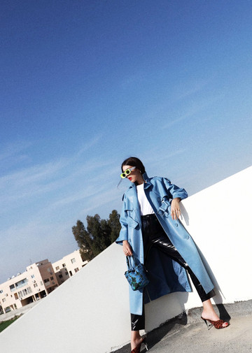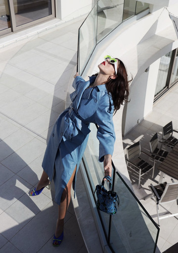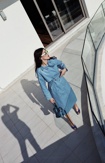 Σε στιλ trenchcoat, με τη σικ σιλουέτα που δημιουργεί η ζώνη, μπορεί άνετα να σταθεί και μόνο του με ένα ζευγάρι mules και all blue everything.