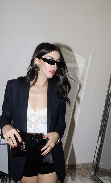 Εδώ, the very polished YSL way, γειώνω το hotpant μου με romantic lace-y μπλούζα, tailored blazer και παιχνιδιάρικη ζώνη. Δημιουργώ χρωματικό contrast στο κάτω μέρος με τα φούξια πέδιλα! Τι σου λέει? Βρες όλο μου το look στην Amicci.