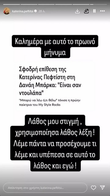 Μετά τον σάλο που προκάλεσε, η Πεφτίτση αναγκάστηκε να ζητήσει δημόσια συγγνώμη, παραδεχόμενη το λάθος της. «Λάθος μου στιγμή, χρησιμοποίησα λάθος λέξη! Λέμε πάντα να προσέχουμε τι λέμε και υπέπεσα σε αυτό το λάθος και εγώ», ανέφερε στη συγγνώμη της, προσπαθώντας να ηρεμήσει τα πνεύματα.