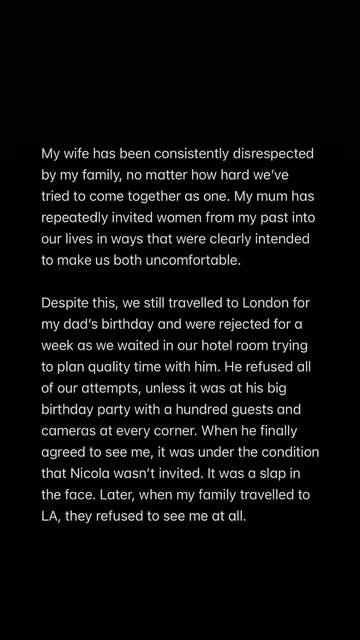 «Έχω μείνει σιωπηλός για χρόνια και έκανα κάθε δυνατή προσπάθεια να κρατήσω αυτά τα ζητήματα ιδιωτικά. Δυστυχώς, οι γονείς μου και η ομάδα τους συνέχισαν να απευθύνονται στον Τύπο, αφήνοντάς μου καμία άλλη επιλογή από το να μιλήσω ο ίδιος και να πω την αλήθεια για μόνο ορισμένα από τα ψέματα που έχουν δημοσιευτεί.