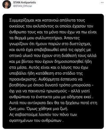 «Συμμερίζομαι και κατανοώ απόλυτα τους οικείους του εκλιπόντος οι οποίοι έχασαν τον άνθρωπό τους και το μόνο που έχω να πω είναι τα θερμά μου συλλυπητήρια. Άπαντες γνωρίζουν ότι ήμουν παρών στο δυστύχημα, και αυτό έχει επιβεβαιωθεί από τις αρχές με οπτικό υλικό που έχουν στη διάθεση τους αλλά και με βίντεο που έχουν δημοσιοποιηθεί ήδη στα μέσα. Αυτός είναι και ο λόγος που έχω υποβάλει ήδη κατάθεση στο στάδιο της προανάκρισης. Αυθόρμητα έσπευσα να βοηθήσω με όποιο δυνατό τρόπο μπορούσα -όχι για να παινευτώ ηρωισμούς – αλλά γιατί ανθρώπινα το ένστικτό μου με οδήγησε εκεί. Αυτά που αντίκρισα δεν θα τα ξεχάσω ποτέ στη ζωή μου. Όμως χάθηκε μια ζωή. Ας σεβαστούμε λοιπόν τον πόνο των αγαπημένων του ανθρώπων».