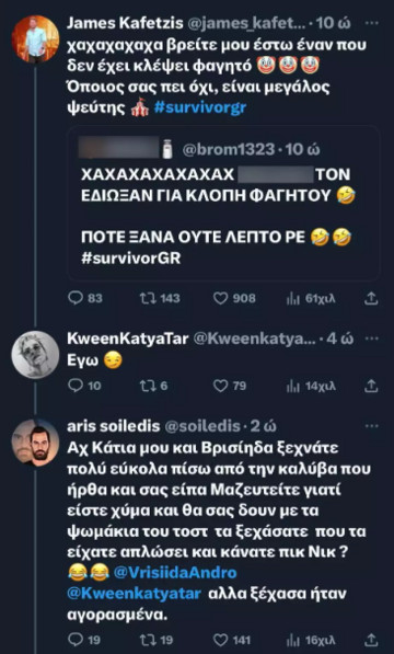 Με αφορμή την αποβολή του Ηλία Γκότση και του Γιωρίκα Πιλίδη από τον σημερινό αγώνα καθώς παραβίασαν κανόνες του ριάλιτι επιβίωσης ο James Καφετζής αποκάλυψε έμμεσα στο προφίλ του στο Twitter ότι δεν υπάρχει παίκτης που δεν έχει κλέψει φαγητό.