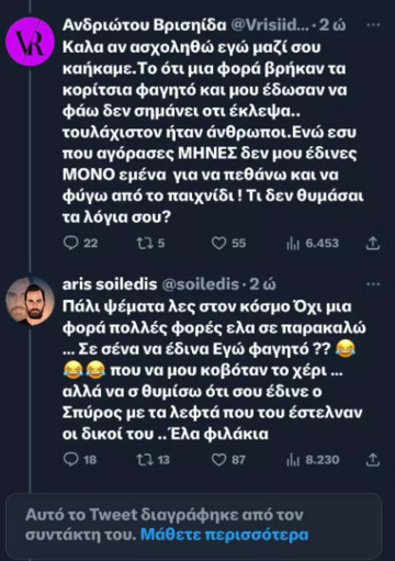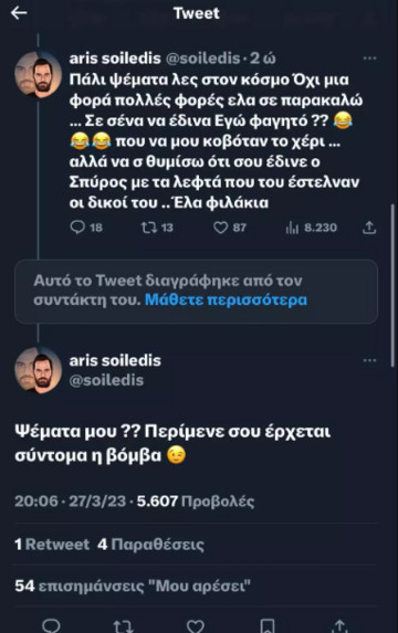 Άρης Σοϊλέδης: «Πάλι ψέματα λες στον κόσμο. Όχι μια φορά πολλές φορές έλα σε παρακαλώ… Σε σένα να έδινα Εγώ φαγητό;; που να μου κοβόταν το χέρι… αλλά να σ θυμίσω ότι σου έδινε ο Σπύρος με τα λεφτά που του έστελναν οι δικοί του… Έλα φιλάκια. Ψέματα; Έλα σου έρχεται η βόμβα».