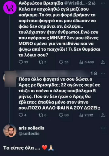 Άρης Σοϊλέδης: «Κάνε λίγο υπομονή Βρισηίδα. Όσον αφορά την παραγωγή άστο γιατί έχασε την μπάλα φέτος. Τα βλέπει όλα ο κόσμος, όλοι με κινητό και φαγητό».