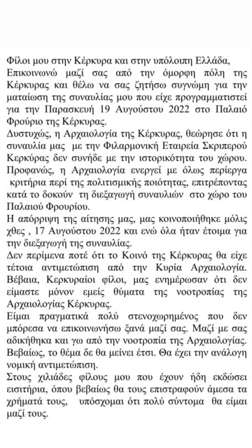 Η απόρριψη της αίτησής μας, μας κοινοποιήθηκε μόλις χθες, 17 Αυγούστου 2022 και ενώ όλα ήταν έτοιμα για τη διεξαγωγή της συναυλίας. Δεν περίμενα ποτέ ότι το κοινό της Κέρκυρας θα είχε τέτοια αντιμετώπιση από την Κυρία Αρχαιολογία.