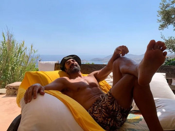 Με φόντο τη θάλασσα και χαλαρή διάθεση, ο Συσσοβίτης ποζάρει άνετος, με το καλογυμνασμένο του σώμα να κλέβει τις εντυπώσεις.