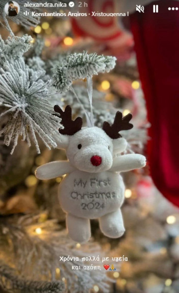 Όπως θα δείτε παρακάτω η χαρούμενη μαμά δημοσίευσε στο προσωπικό της λογαριασμό στο Instagram δύο στιγμιότυπα, με το ένα να έχει ένα στολίδι που γράφει «Τα πρώτα Χριστούγεννα του μωρού» ενώ στη δεύτερη φυτογραφία βλέπουμε τον μικρό να φορά ένα χριστουγεννιάτικο φορμάκι όσο ηχεί από πίσω το τραγούδι του, Κωνσταντίνου Αργυρού: «Χριστούγεννα Μαζί».