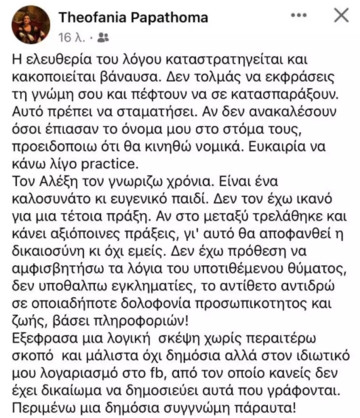 Το μεσημέρι της Παρασκευής, 21 Απριλίου, η Θεοφανία Παπαθωμά προχώρησε σε νέο post γράφοντας ότι «η ελευθερία του λόγου καταστρατηγείται και κακοποιείται βάναυσα. Δεν τολμάς να εκφράσεις τη γνώμη σου και πέφτουν να σε κατασπαράξουν. Αν δεν ανακαλέσουν όσοι έπιασαν το όνομά μου στο στόμα τους, προειδοποιώ ότι θα κινηθώ νομικά. Ευκαιρία να κάνω λίγο practice».