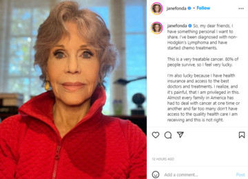«Λοιπόν, αγαπητοί μου φίλοι, έχω κάτι προσωπικό που θέλω να μοιραστώ. Έχω διαγνωστεί με λέμφωμα non-Hodgkin και έχω ξεκινήσει χημειοθεραπείες», ανέφερε η Τζέιν Φόντα αρχικά στο Instagram.