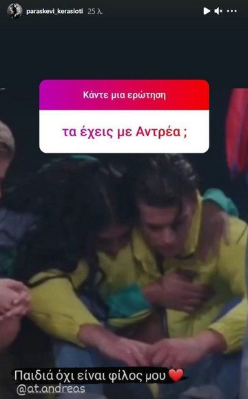 Η πρώην παίκτρια του GNTM 3, έκανε ένα Q&A στον προσωπικό της λογαριασμό της στο Instagram και μεταξύ άλλων απάντησε ανοιχτά στο αν βρίσκεται σε σχέση με τον Ανδρέα, καθώς οι δυο τους είχαν έρθει πολύ κοντά στο παιχνίδι.