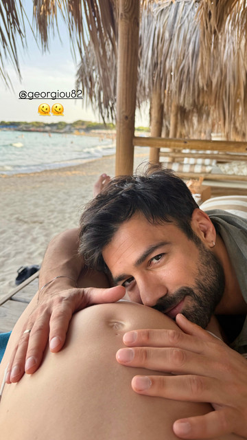 Ανάμεσα στα στιγμιότυπα, ξεχώρισε μία φωτογραφία που δείχνει τον Ανδρέα Γεωργίου να ακουμπά με στοργή τη φουσκωμένη κοιλιά της αγαπημένης του, με το χαμόγελό του να αποτυπώνει όλη την ευτυχία της επικείμενης πατρότητας.
