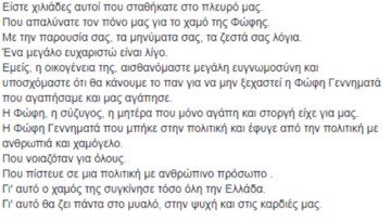 Με την παρουσία σας, τα μηνύματα σας, τα ζεστά σας λόγια. Ένα μεγάλο ευχαριστώ είναι λίγο.Εμείς, η οικογένεια της, αισθανόμαστε μεγάλη ευγνωμοσύνη και υποσχόμαστε ότι θα κάνουμε το παν για να μην ξεχαστεί η Φώφη Γεννηματά που αγαπήσαμε και μας αγάπησε. Η Φώφη, η σύζυγος, η μητέρα που μόνο αγάπη και στοργή είχε για μας. Η Φώφη Γεννηματά που μπήκε στην πολιτική και έφυγε από την πολιτική με ανθρωπιά και χαμόγελο. Που νοιαζόταν για όλους. Που πίστευε σε μια πολιτική με ανθρώπινο πρόσωπο. Γι’ αυτό ο χαμός της συγκίνησε τόσο όλη την Ελλάδα. Γι’ αυτό θα ζει πάντα στο μυαλό, στην ψυχή και στις καρδιές μας».