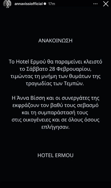 «Το Hotel Ερμού θα παραμείνει κλειστό το Σάββατο 28 Φεβρουαρίου, τιμώντας τη μνήμη των θυμάτων της τραγωδίας των Τεμπών. Η Άννα Βίσση και οι συνεργάτες της εκφράζουν τον βαθύ τους σεβασμό και τη συμπαράστασή τους στις οικογένειες και σε όλους όσους επλήγησαν. HOTEL ERMOU», αναφέρει η ανακοίνωση.