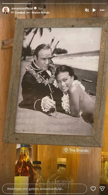 Σε ένα από τα δύο στιγμιότυπα που δημοσίευσε στο Instagram η Άννα Βίσση ποζάρει με το μαγιό της σε ένα μπαρ σε παραλία, ενώ στο επόμενο φαίνεται η χαρακτηριστική εικόνα του Μάρλον Μπράντο από την ταινία Mutiny on the Bounty που στόλιζε το μπαρ.