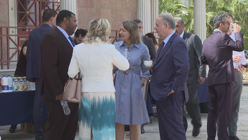 Λίγη ώρα μετά εμφανίστηκε με παρόμοιο outfit και η Πρέσβειρα της Πορτογαλίας, η οποία κέντρισε τα βλέμματα. Η ίδια φορώντας και αυτή το μπλε και λευκό outfit που έμοιαζε στις στιλιστικές γραμμές που επέλεξε η Πρόεδρος της Βουλής, ολοκλήρωσε το ντύσιμό της με κοσμήματα και χρυσές λεπτομέρειες.