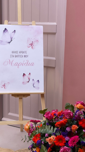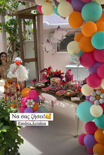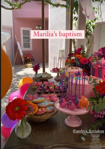 Κεντρικό θέμα της βάπτισης ήταν οι μαργαρίτες. Έτσι, στήθηκε ένα υπέροχο πολύχρωμο σκηνικό με βάση το συγκεκριμένο λουλούδι. Τη διακόσμηση ολοκλήρωναν μπαλόνια, πεταλούδες και φυσικά μπόλικα γλυκά σε παστέλ αποχρώσεις.