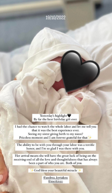 Λίγες ώρες αργότερα, η αδελφή της Άντρεας, Μαλβίνα Κυριάκου, μοιράστηκε μια φωτογραφία της μικρής και κάποιες σκέψεις της ενώ αποκάλυψε ότι βρισκόταν μέσα στο δωμάτιο του τοκετού της αδελφής της αλλά και ότι ήρθε ανήμερα των γενεθλίων της.