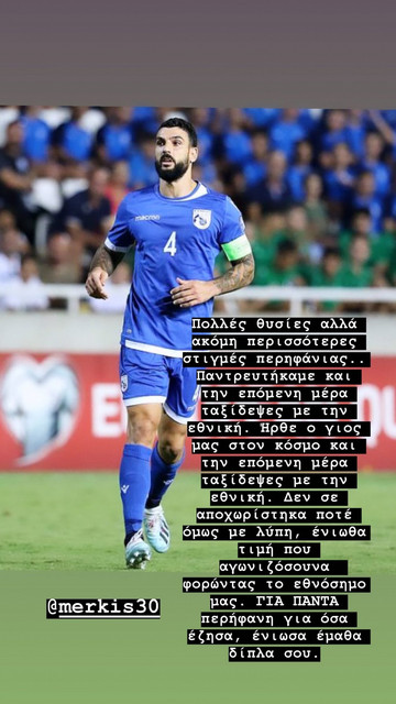Η γνωστή ραδιοφωνική παραγωγός θέλησε να τοποθετηθεί μετά την αποχώρηση του άντρα της και έτσι, μέσα από τον προσωπικό της λογαριασμό στο Instagram, μοιράστηκε τις σκέψεις της, τη περηφάνια που ένιωθε κάθε φορά που ο ίδιος, αγωνιζόταν με τη φανέλα της Κύπρου, επισημαίνοντας τις θυσίες που έκανε ο ποδοσφαιριστής για την ομάδα.