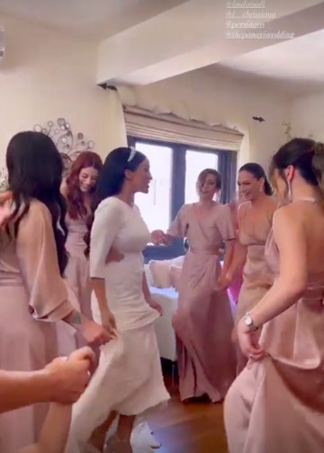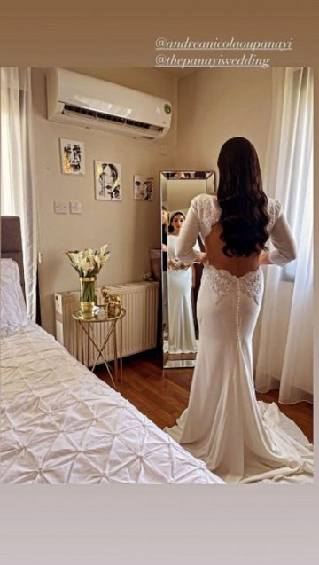 Η νύφη επέλεξε ένα μίνιμαλ λευκό σατέν νυφικό της Κύπριας σχεδιάστριας Έφης Παπαϊωάννου ενώ το look της ολοκληρώνει ένα λευκό headband στα μαλλιά.