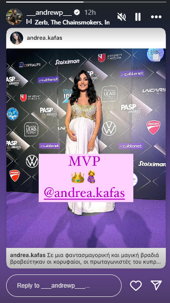 Λίγες ώρες αργότερα, και αφού ανέβασε μερικές φωτογραφίες στον προσωπικό της λογαριασμό στο Instagram, ο Αντρέας έκανε share σε Instagram story τη δημοσίευση της γράφοντας: “MVP @andrea.kafas”!