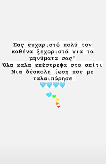Λίγο αργότερα, η Άντρη Καραντώνη επανήλθε με νέες αναρτήσεις εξηγώντας το λόγο που εισήχθη στο νοσοκομείο. Η παρουσιάστρια αποκάλυψε ότι είχε μια ίωση που την ταλαιπώρησε αλλά πλέον βρίσκεται στο σπίτι της.