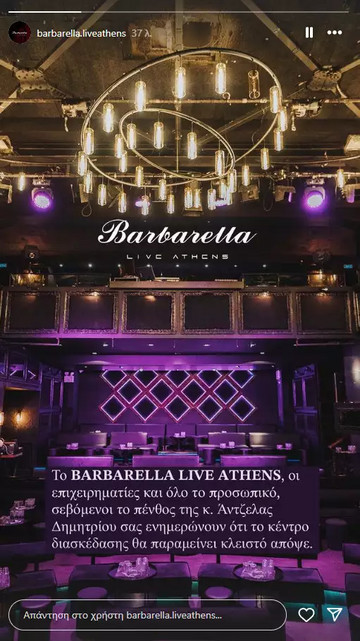 Η ανακοίνωση αναφέρει «Το Barbarella Live Athens, οι επιχειρηματίες και όλο το προσωπικό, σεβόμενοι το πένθος της κ. Άντζελας Δημητρίου σας ενημερώνουν ότι το κέντρο διασκέδασης θα παραμείνει κλειστό απόψε».