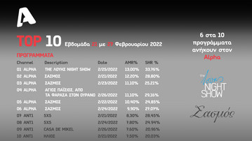 Το “Λούης Night Show” μονοπωλεί το ενδιαφέρον κάθε εβδομάδα όπως και η σειρά Σασμός. Η επιτυχία συνεχίζεται με τον “Άγιο Παϊσιο” , ο οποίος σαρώνει στα Σαββατόβραδα μας. Μάλιστα, η επιτυχία είναι χρωμματισμένη με κόκκινα αφού τα 6 κορυφαία προγράμματα της εβδομάδας εκπέμπουν από τον Alpha .
