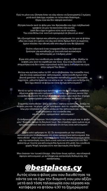 «Είμαι στη μέση του πουθενά, μου ανάβουν φάρο, κόβω, βγάζω το κεφάλι μου από το παράθυρο και τους λέω είναι δυνατόν να σταματήσω ενώ δεν είσαι περιπολικό;» έγραψε χαρακτηριστικά.