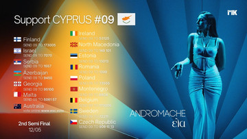 Η Κύπρος εμφανίζεται στην 9η θέση του Ημιτελικού και καλούνται οι Κύπριοι, οι Έλληνες και οι φίλοι της Κύπρου όπως στηρίξουν την Κύπρο στέλνοντας στον αριθμό των κρατικών καναλιών που συμμετέχουν.