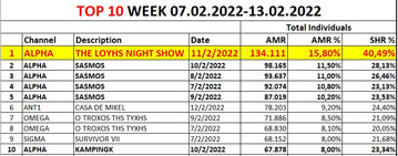 Αξίζει να τονιστεί ότι κυριαρχεί και στο top 10 της εβδομάδας αφού 6 στα 10 προγράμματα ανήκουν στον Alpha. Μάλιστα, το top 5 είναι μόνο… Alpha