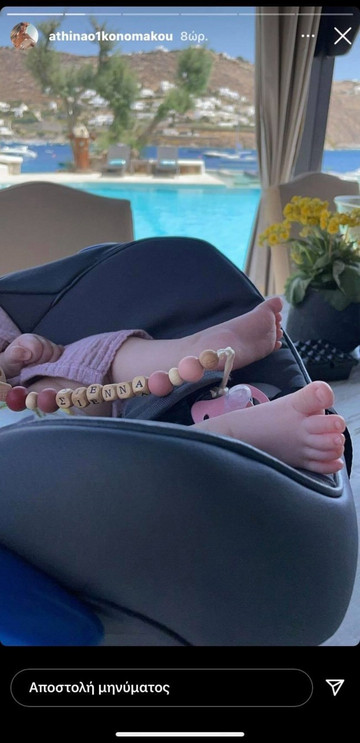 Πιο συγκεκριμένα, η Αθηνά Οικονομακου δημοσίευσε στον προσωπικό της λογαριασμό στο instagram μία φωτογραφία στην οποία μητέρα και κόρη βρίσκονται κοντά στην πισίνα του ξενοδοχείου τους. Η χαρούμενη μητέρα φωτογράφισε τα μικροσκοπικά πόδια της δύο μηνών Σιέννα, όσο εκείνη κάθεται αναπαυτικά στο καρεκλάκι της, κοντά της μάλιστα βρίσκεται ένα χαριτωμένο μπρελόκ που γράφει πάνω το όνομά της.
