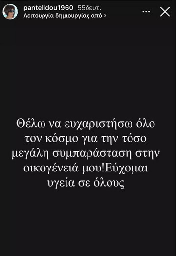 Συγκεκριμένα, η Αθηνά Παντελίδη, έγραψε: «Θέλω να ευχαριστήσω όλο τον κόσμο για την τόσο μεγάλη συμπαράσταση στην οικογένειά μου! Εύχομαι υγεία σε όλους».