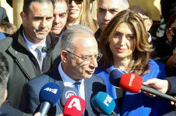 Η σύζυγός του, Μαρία Σελίπα εντυπωσίασε με την ενδυματολογική της επιλογή, καθώς φόρεσε μπλε κοστούμι με μαύρο top και μαύρο παντελόνι.