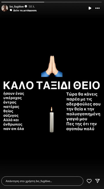 Ο Μπo μέσα από την σπαρακτική και συγκινητική του ανάρτηση αποχαιρέτησε τον αγαπημένο του θείο, τον οποίο τον χαρακτήρισε υπέροχο σύζυγο, πατέρα, θείο, άντρα και πάνω από όλα άνθρωπο.