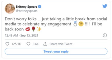 Η Britney Spears αναφέρθηκε σε αυτή της την απόφαση, μέσω του προσωπικού της λογαριασμού στο Twitter, γράφοντας: “Μην ανησυχείτε…απλά κάνω ένα διάλειμμα από τα social media για να γιορτάσω τον αρραβώνα μου!!!! Θα επιστρέψω σύντομα”.