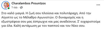 Σε ανάρτηση που έκανε το μεσημέρι του Σαββάτου, 3 Μαΐου, ο κ. Προύντζος μοιράστηκε μια φωτογραφία μαζί με λίγα, αλλά βαθιά λόγια, τιμώντας τη μνήμη της γυναίκας που αποτέλεσε για τον ίδιο πρότυπο ζωής.