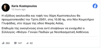 Πιο μετά, το βράδυ, η σύζυγος και τα παιδιά του ενημέρωσαν με τον ίδιο τρόπο για την κηδεία του Χάρη Κωστόπουλου.