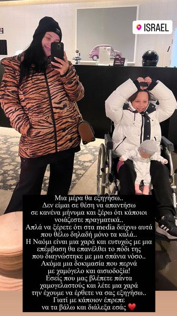 Η γνωστή Κύπρια wedding planner του νησιού, μοιράστηκε μια φωτογραφία με την κόρη της, που βρισκόταν σε αναπηρικό αμαξίδιο ενώ αποκάλυψε ότι βρίσκονται στο Ισραήλ. Μέσω αυτής της ανάρτησης, γνωστοποίησε ότι η κόρη της έχει διαγνωστεί με μία σπάνια νόσο στο πόδι.